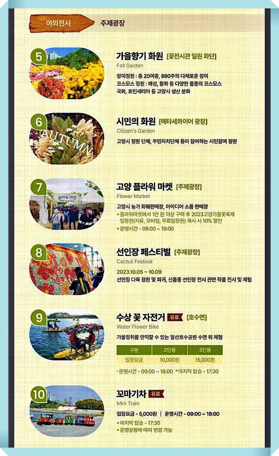 - 가을향기 화원, 시민의 화원, 고양 플라워 마켓, 선인장 페스티벌, 수상 꽃 자전거, 꼬마 기차