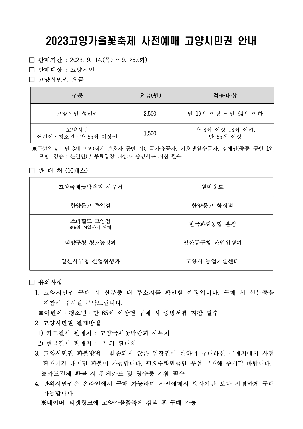 지금까지 고양 가을 꽃 축제 일정과 즐길거리 등을 정리했습니다. 2023 고양 가을꽃축제 입장권은 고양꽃전시관과 네이버, 티켓링크 등 다양한 판매채널을 통해 구입할 수 있으며, 행사 관련 자세한 사항은 고양국제꽃박람회 누리집, 블로그, 공식 SNS 등 다양한 채널을 통해 확인할 수 있으니 참고하시기 바랍니다.