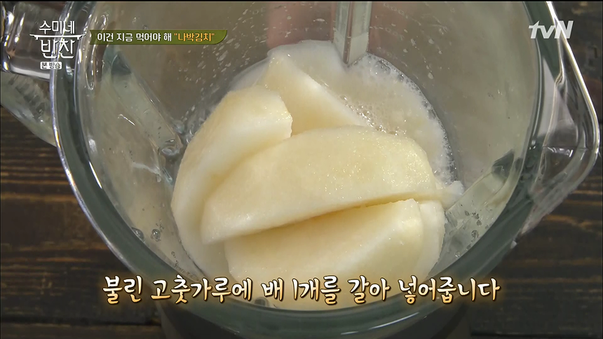5. 불린 고춧가루에 배 1개를 갈아서 넣어줍니다.