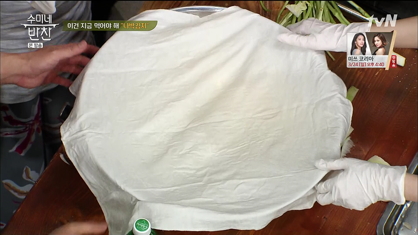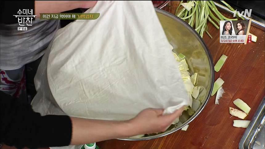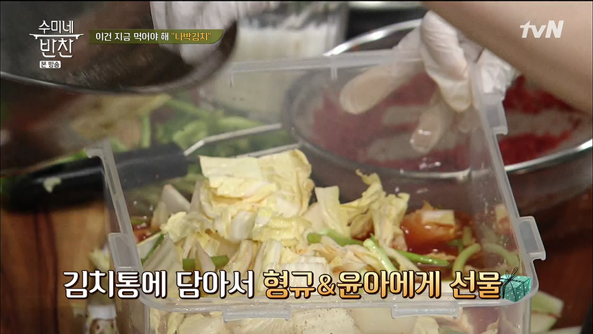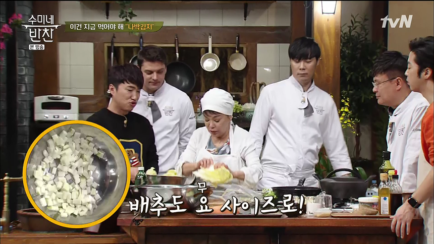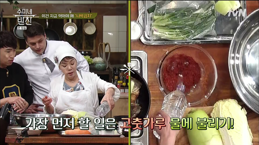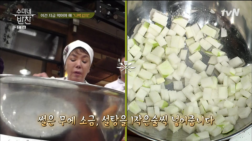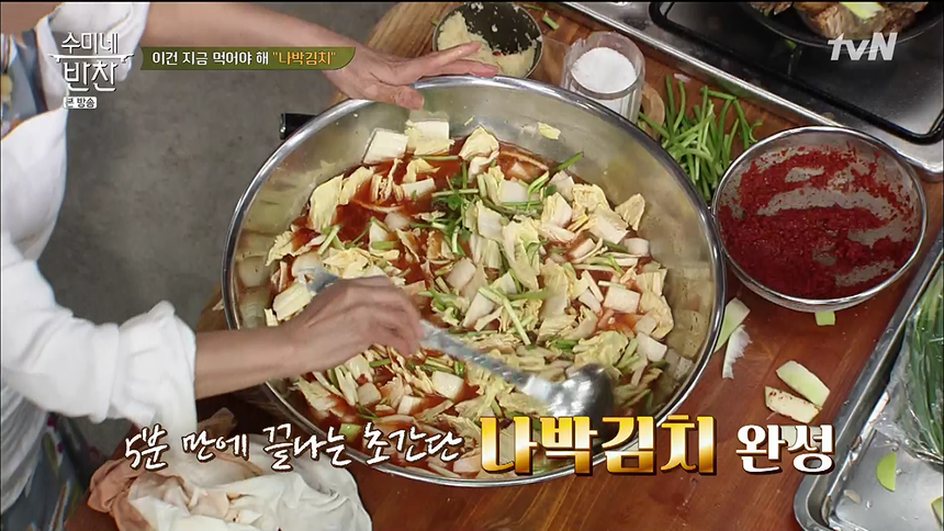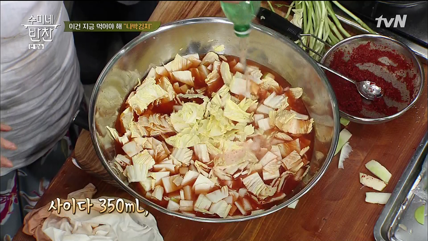 재료 : 무, 배추, 미나리, 배, 고춧가루, 물, 다진 마늘, 소금, 설탕, 사이다