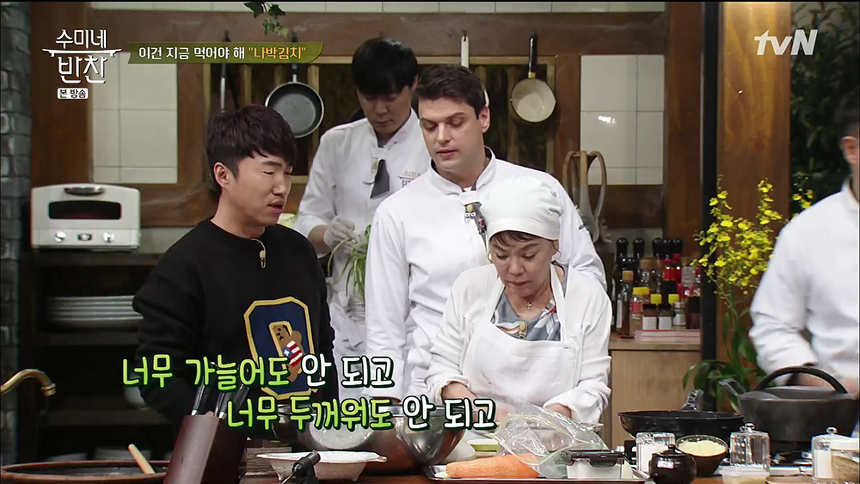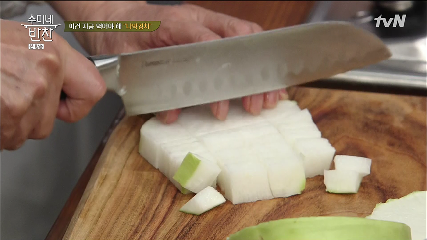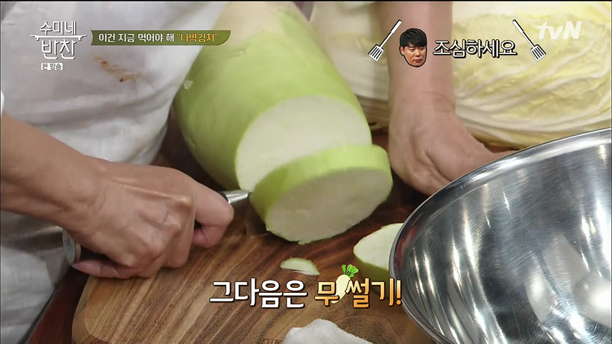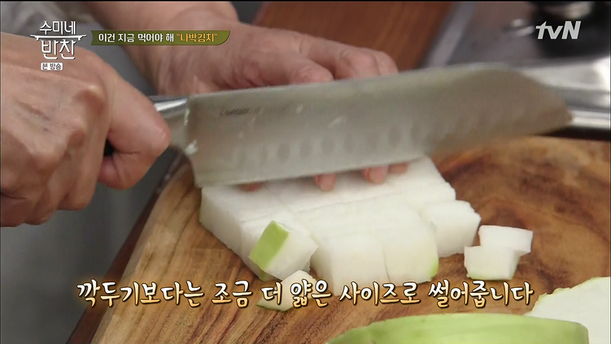 2. 그 다음은 무 썰기인데 깍두기보다는 조금 더 얇은 사이즈로 썰어줍니다. 너무 가늘어도 안되고 너무 두꺼워도 안된다고 해요.
