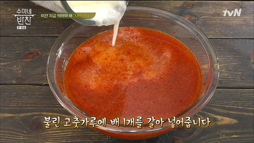 7. 간 배를 불린 고춧가루물에 넣어주세요.