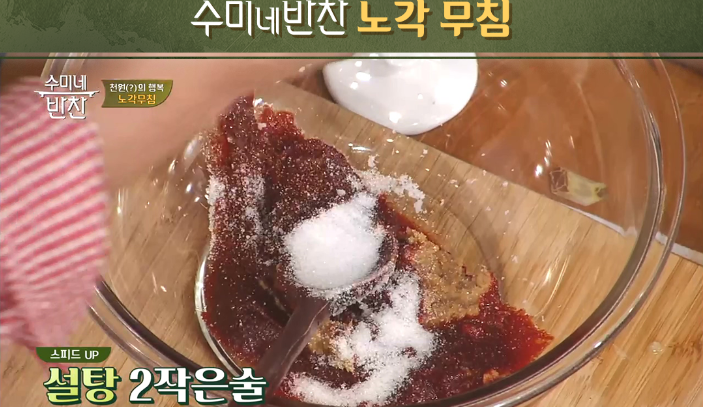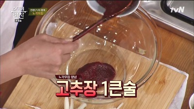 3. 노각무침 황금레시피 늙은 오이 맛있게 만드는 법 이제 양념장을 만들 차례인데요, 고추장 1큰술, 된장 1/2큰술, 소금 1작은술, 설탕 2작은술, 다진마늘 한 움큼, 식초를 넣어 양념장을 만듭니다.
