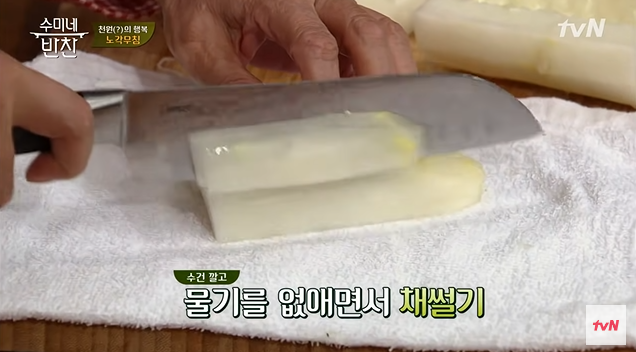 2. 씨를 뺀 노각은 물기를 없애면서 굵게 채 썰어 주시는데 노각무침 황금레시피 늙은 오이 맛있게 만드는 법 포인트는 노각을 나무젓가락 사이즈로 굵게 썰어야 한다는 것입니다.