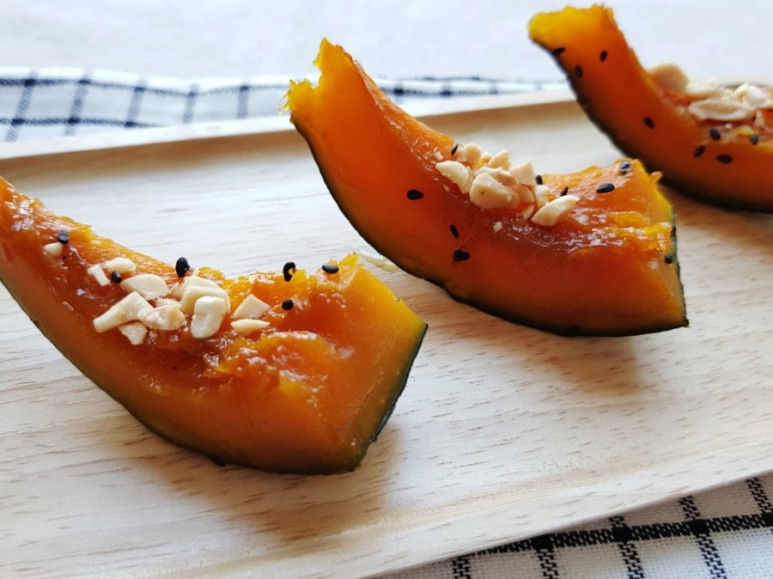 재료: 단호박 1통(약 1kg), 설탕 2큰술, 간장 2큰술, 올리고당 4큰술, 통깨 적당량