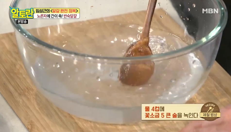 9. 그릇에 물 4컵을 넣은 뒤 꽃소금 5큰술을 녹입니다.