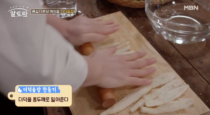 2. 껍질을 벗긴 더덕은 밀대로 납작하게 밀어주세요. 더덕을 방망이로 두드리면 향과 식감이 떨어지기 때문에 밀대를 사용합니다.