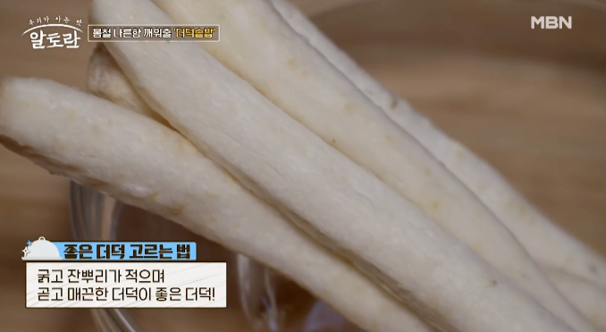 더덕을 고를 때는 뿌리가 희고 굵으며 몸 전체가 곧게 쭉 뻗은 것이 좋은 더덕입니다. 또한 겉의 주름이 깊지 않고 잔가지가 많지 않은 것을 고르는 것이 좋은데요, 지나치게 울퉁불퉁하거나 몸체가 짤막하지 않은 것, 향이 진한 것이 좋은 더덕입니다. 쪼개봤을 때는 하얀 즙액이 많이 나오고 내부에 심이 없이 부드러운 것이 좋고 머리 부분은 1cm 이하로 짧은 것이 좋으니 참고하시기 바랍니다.