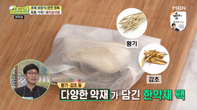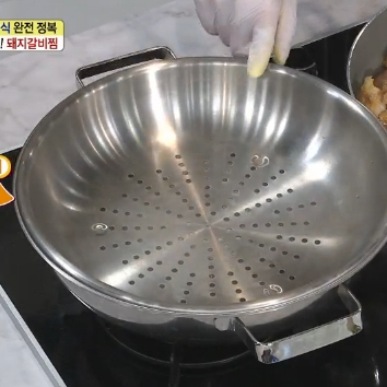 5. 돼지갈비찜 고기 굽기가 끝나면 물이 끓고 있는 찜통에 삼계탕용 한약재 팩을 넣습니다. 돼지갈비찜 맛있게 만드는 법 양념 황금레시피의 숨은 비법이라고 볼 수 있는데 돼지고기를 삶지않고 쪄야 한다는 것입니다.