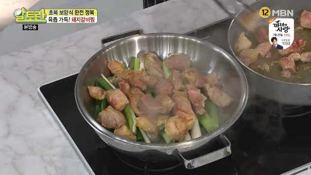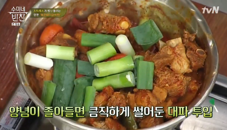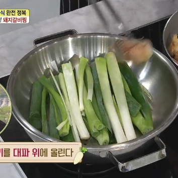 12. 양념이 졸아들면 큼직하게 썰어둔 대파를 넣으면 김수미 돼지갈비찜 맛있게 만드는 법 양념 황금레시피가 완성됩니다.