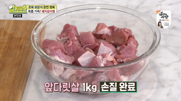 1. 먼저 앞다리살 1kg은 3X3cm 크기로 썰어주세요. 토니오 셰프의 돼지갈비찜 맛있게 만드는 법 양념 황금레시피에서는 앞다리살을 사용하는데요, 이 부위는 지방이 적어 국물에 기름이 뜨지 않고 가격이 저렴하며 비타민B1이 풍부하여 에너지대사를 도울 뿐 아니라 젖산의 촉진을 막아준다는 장점이 있습니다.