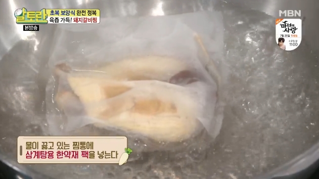 5. 돼지갈비찜 고기 굽기가 끝나면 물이 끓고 있는 찜통에 삼계탕용 한약재 팩을 넣습니다. 돼지갈비찜 맛있게 만드는 법 양념 황금레시피의 숨은 비법이라고 볼 수 있는데 돼지고기를 삶지않고 쪄야 한다는 것입니다.