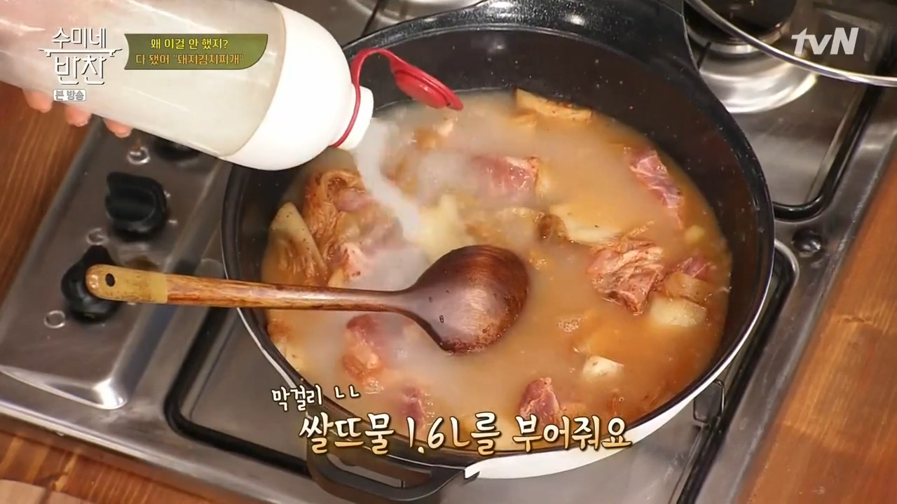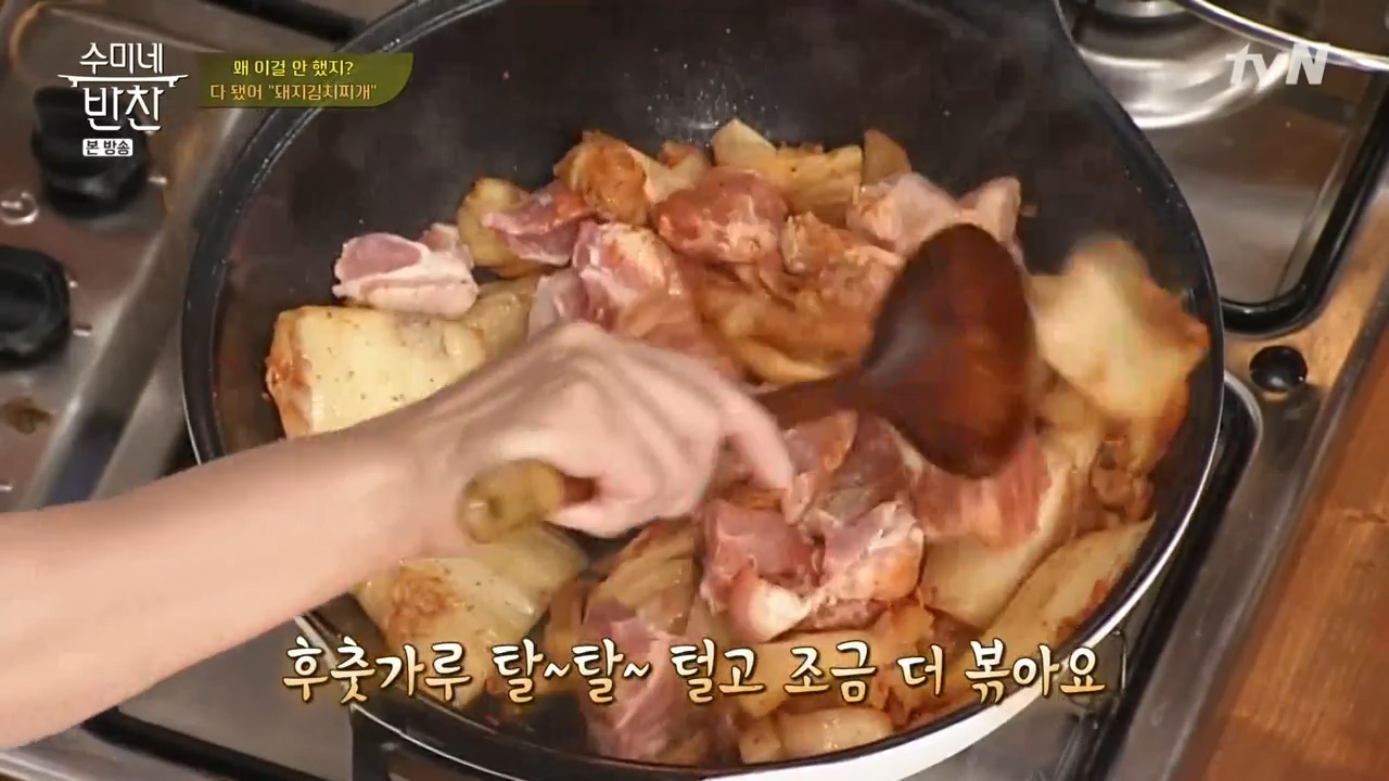 3. 돼지 목살을 큼직하게 썰고, 묵은지와 함께 볶아준 뒤 후춧가루 3번, 쌀뜨물 1.6 L와 김칫국물 2국자를 넣어 주세요.