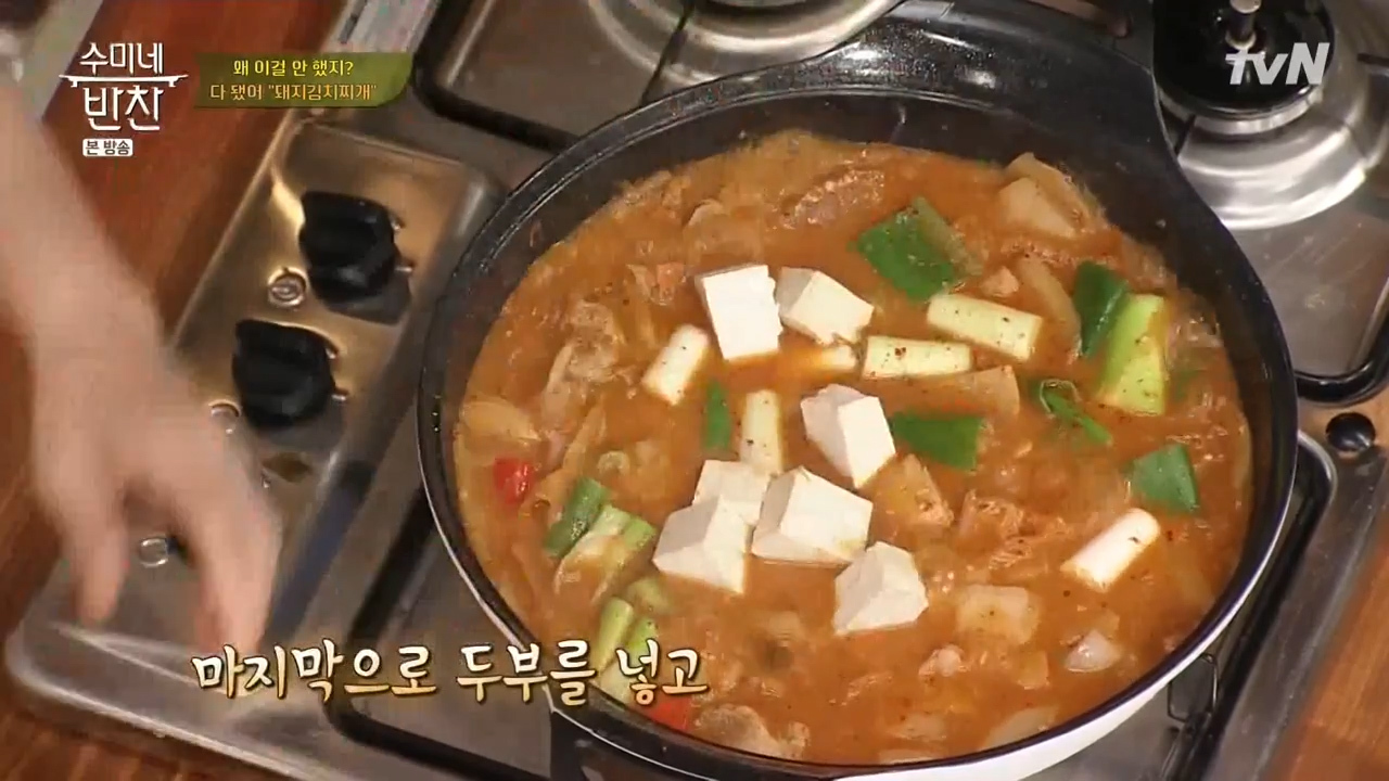 9. 잘라놓은 두부를 넣고 5분 정도 끓이다가 중불로 바꿔 10분 정도 더 끓이면 돼지고기 김치찌개 황금레시피 맛있게 만드는 방법이 완성됩니다.
