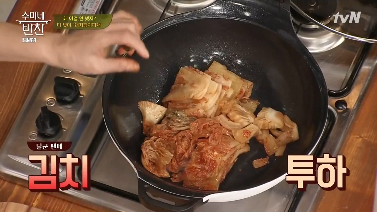 2. 냄비에 썰어놓은 묵은지를 넣고 약불에 볶습니다.