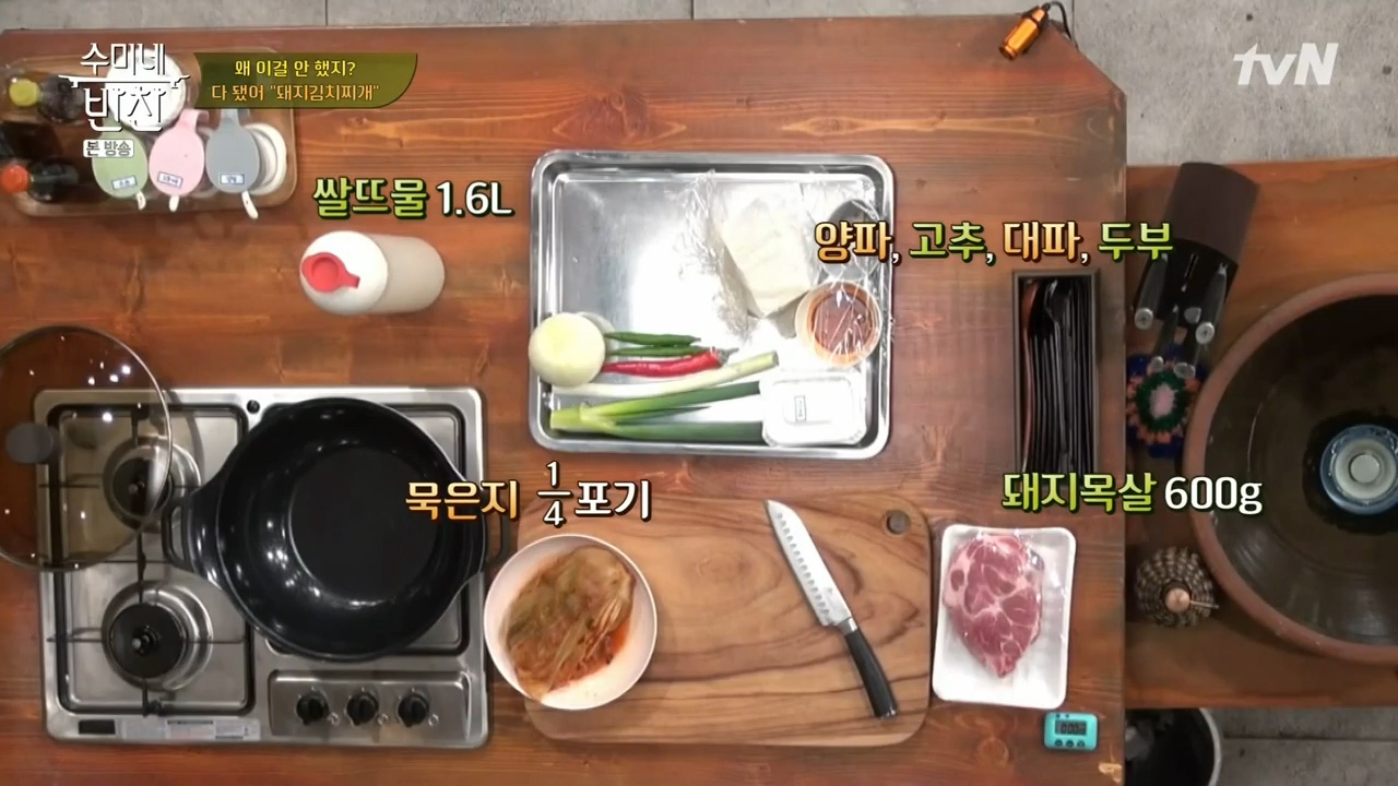 재료 : 묵은지 1/4 포기, 돼지목살 200~300g, 김칫국물 3~4국자, 쌀뜨물 1.6 L, 후춧가루, 다진마늘 1큰술 반, 새우젓 1큰술, 매실액 2큰술, 고춧가루 7작은 술, 양파 1개, 대파 1대, 청양고추 홍고추 각 1개, 두부 반 모, 국간장 1큰술, 양조간장 1큰술 반