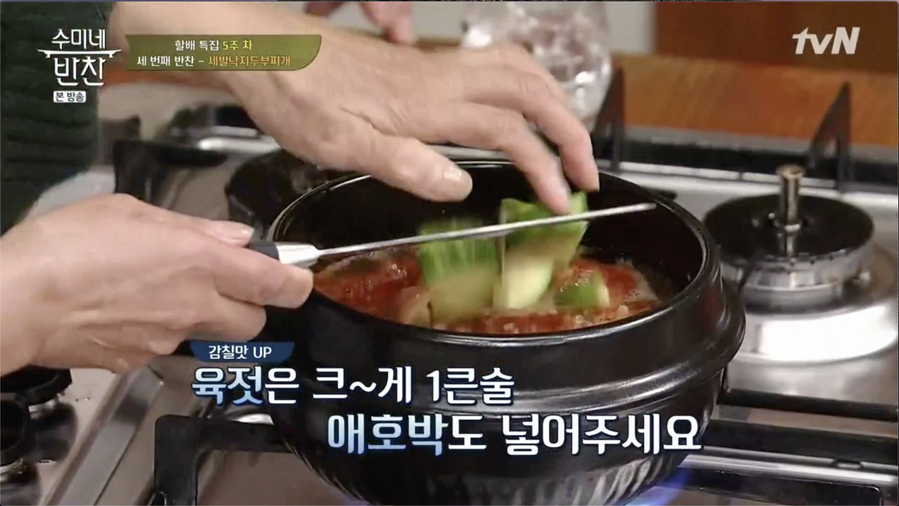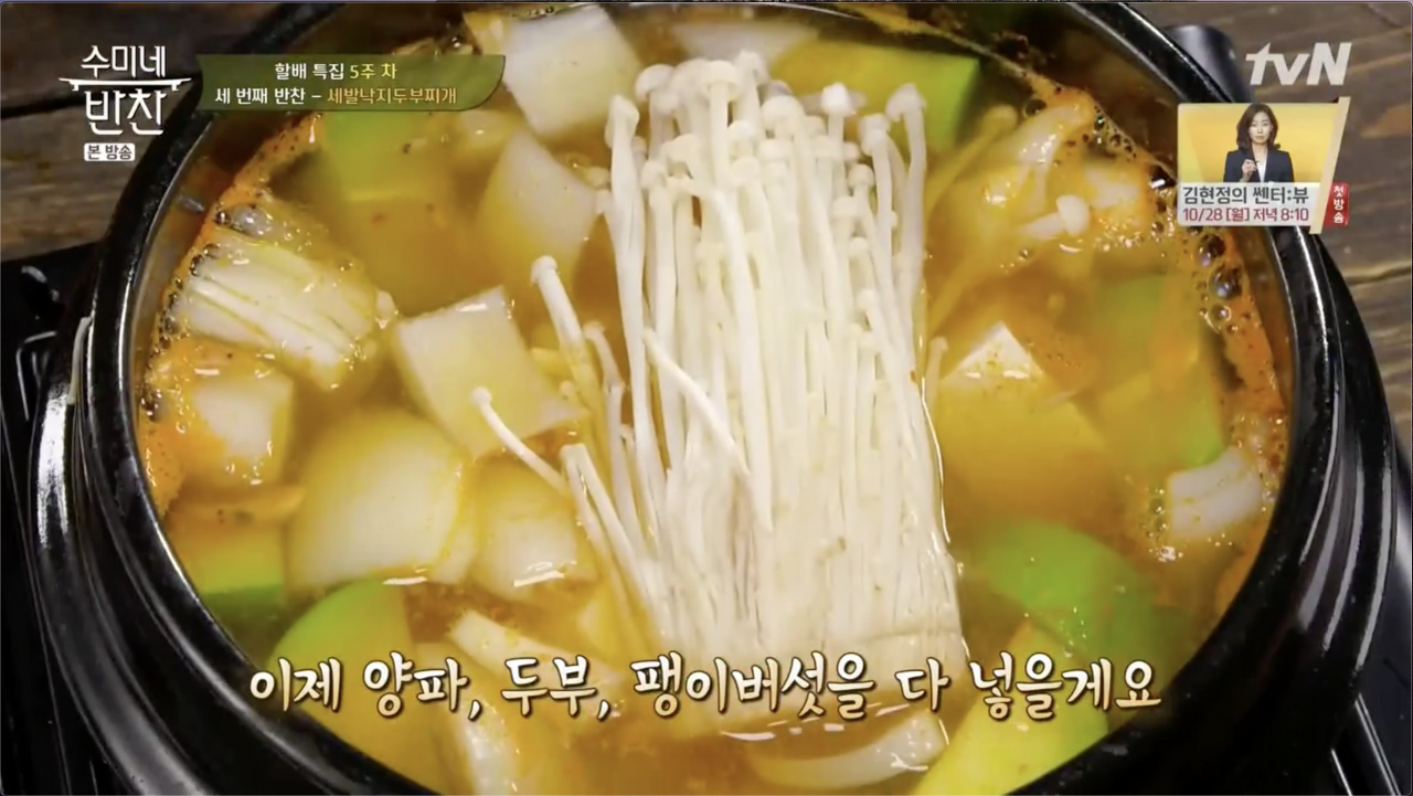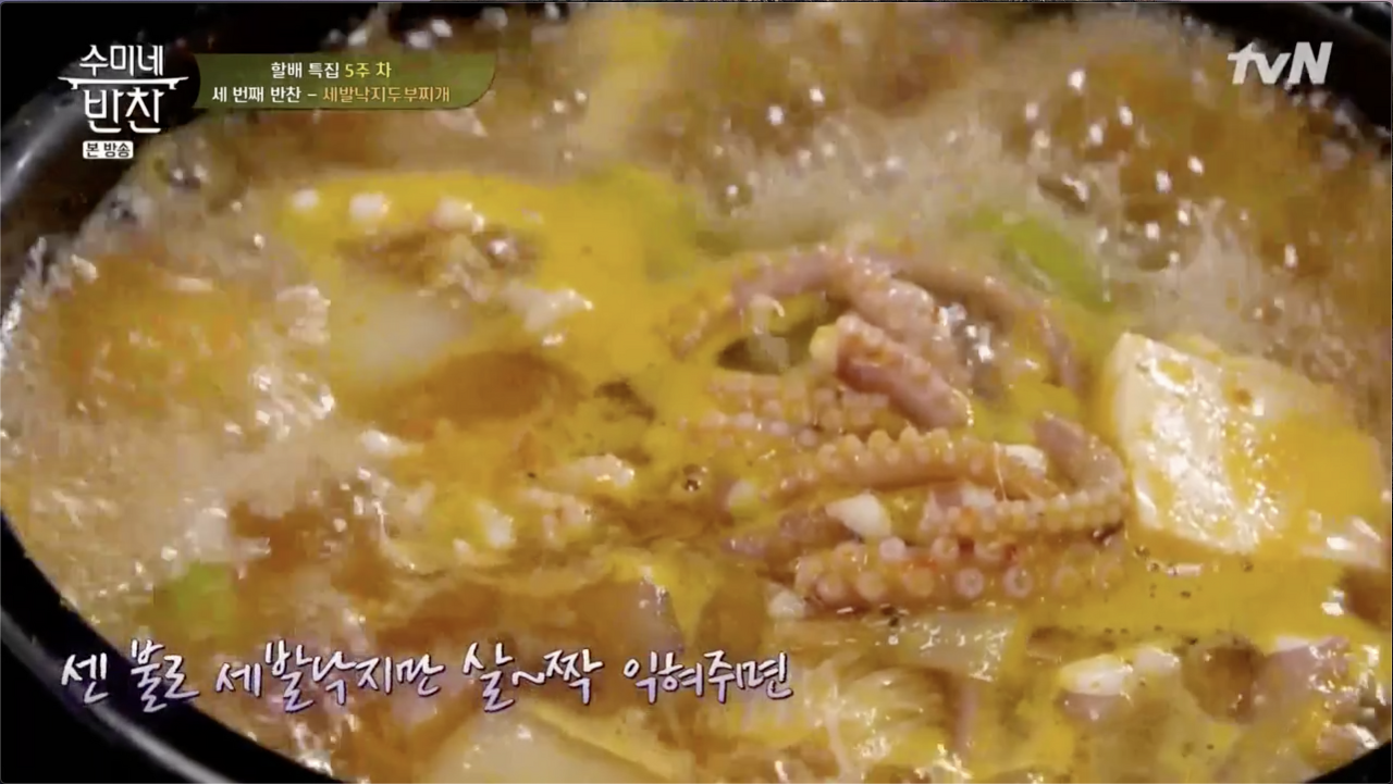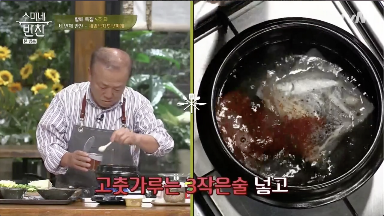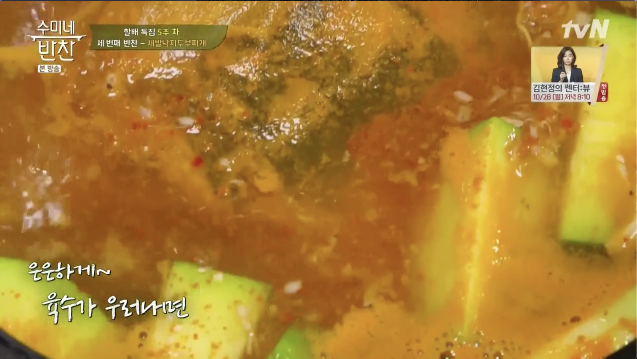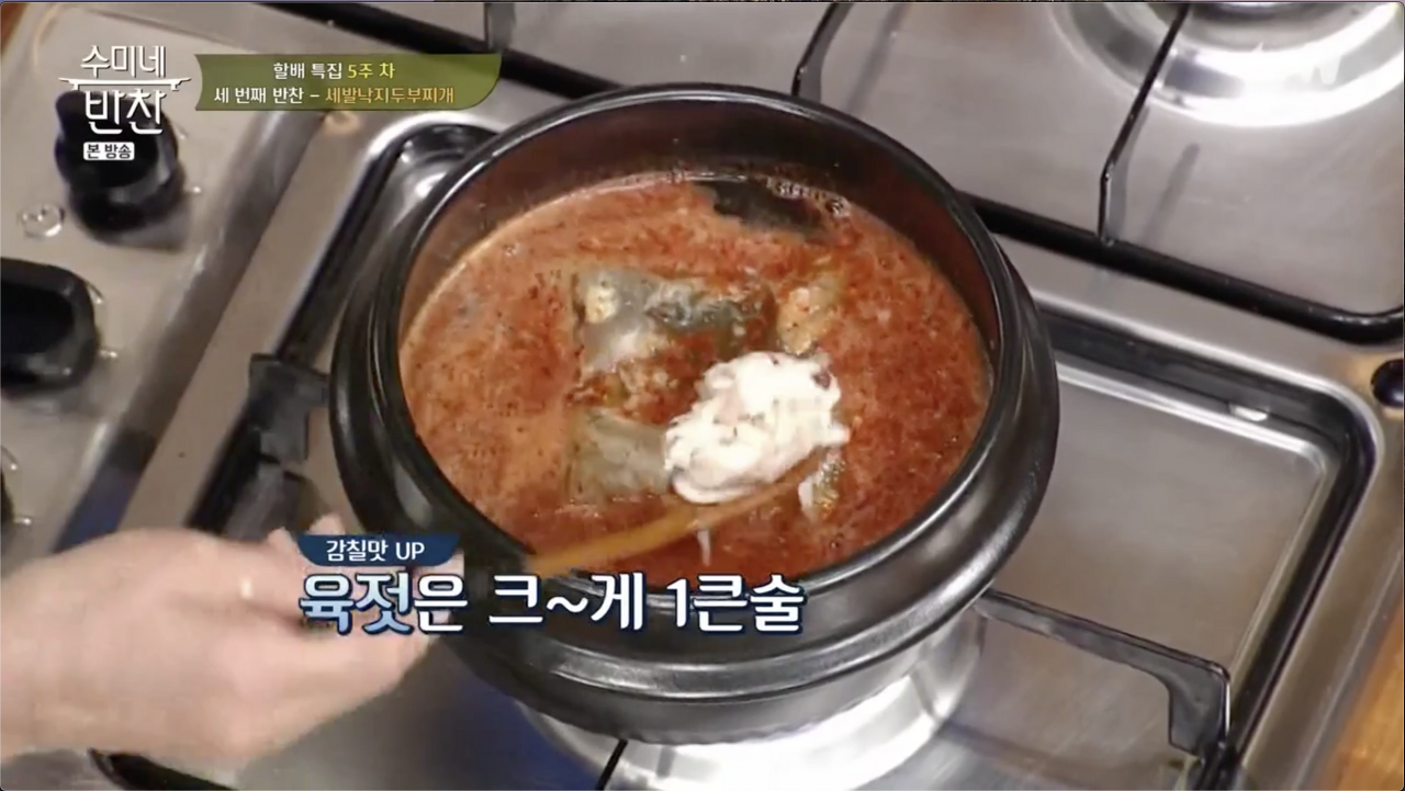 13. 마지막으로 국물 간을 보는데 참고로 낙지는 아직 넣는 것이 아니구요, 밥상차릴 동안 넣어도 된다고 해요. 또한 낙지 대가리는 먹물이 나와서 안 자른다고 하시네요.