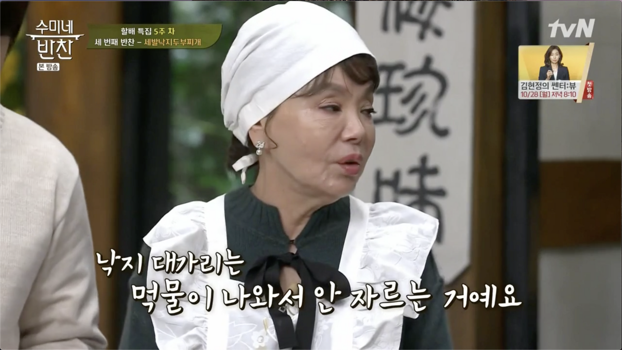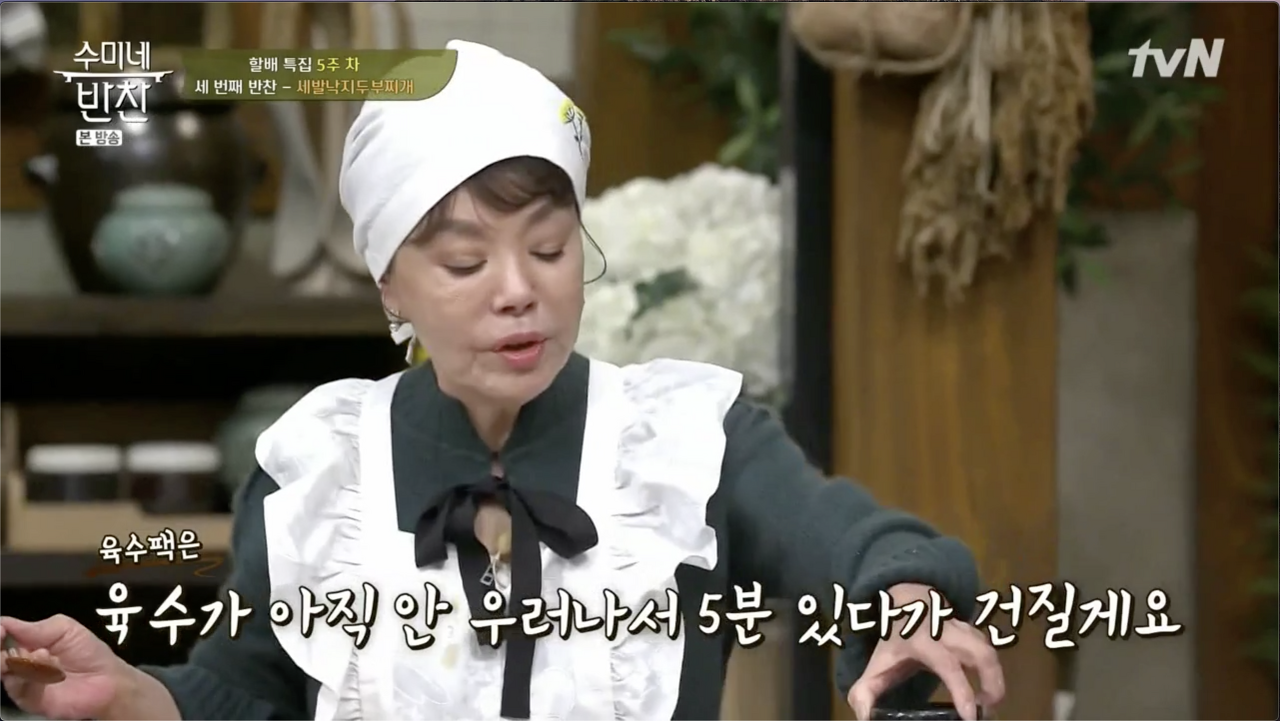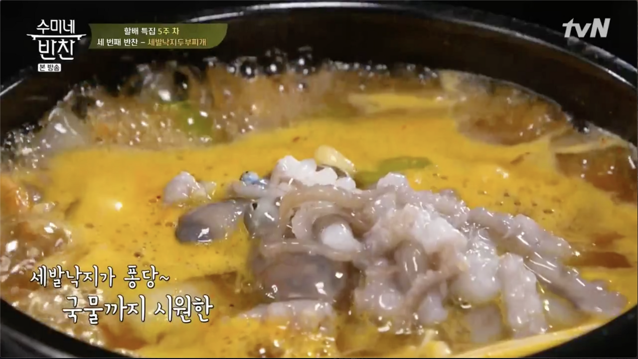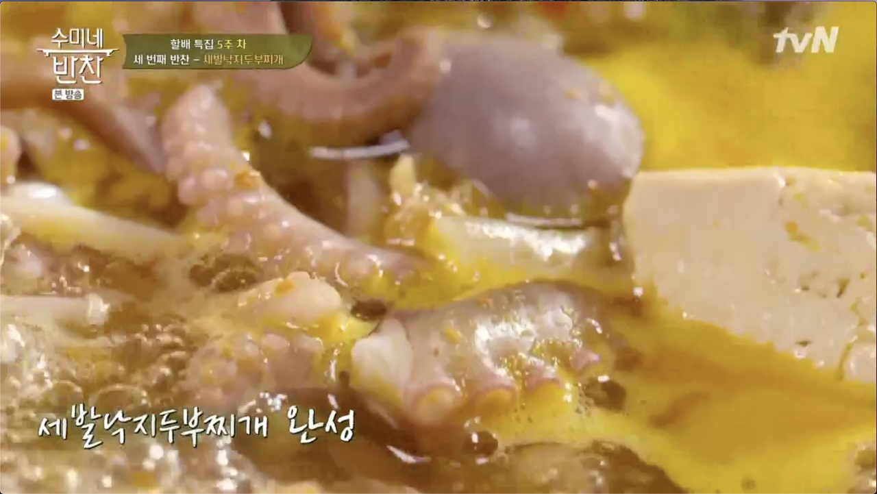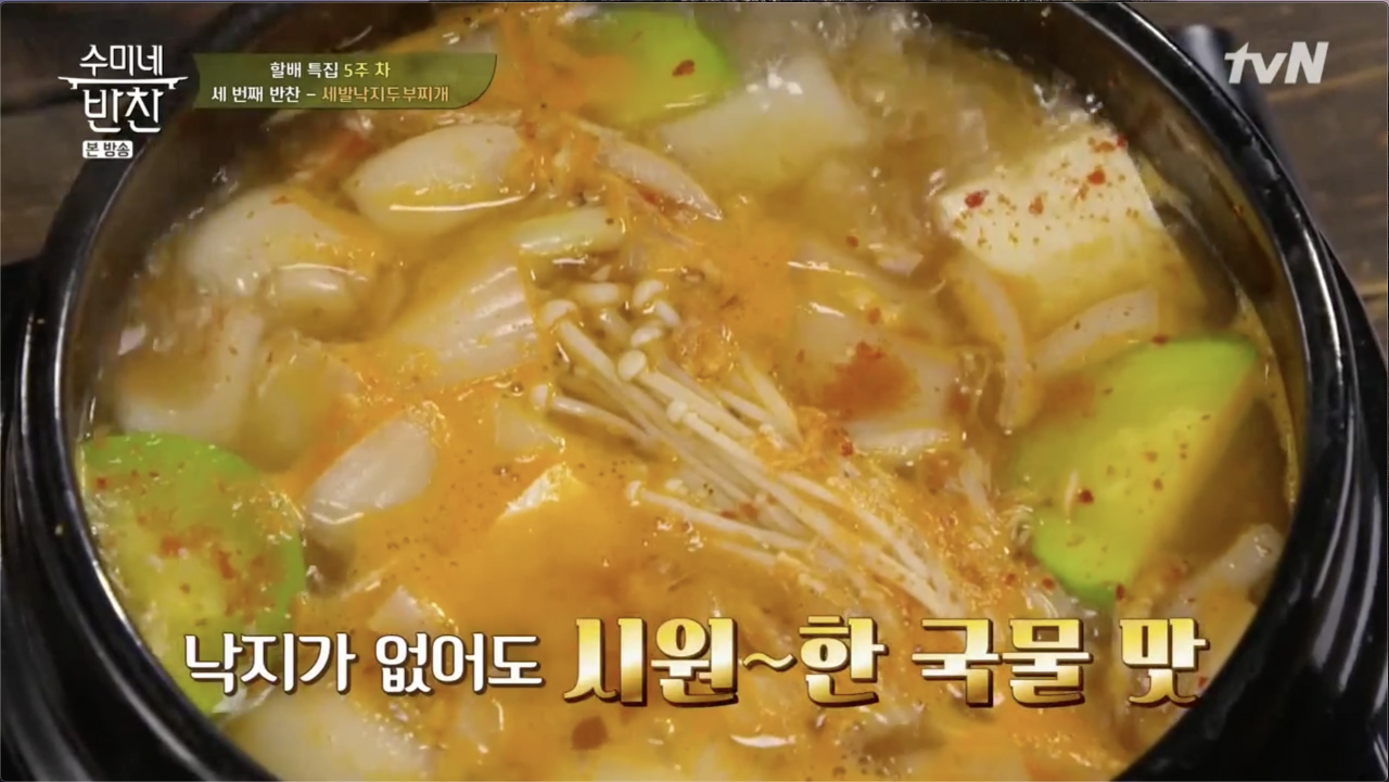 13. 마지막으로 국물 간을 보는데 참고로 낙지는 아직 넣는 것이 아니구요, 밥상차릴 동안 넣어도 된다고 해요. 또한 낙지 대가리는 먹물이 나와서 안 자른다고 하시네요.