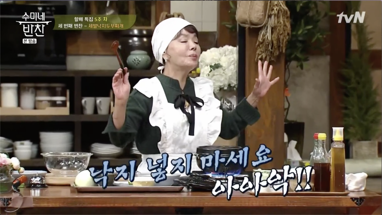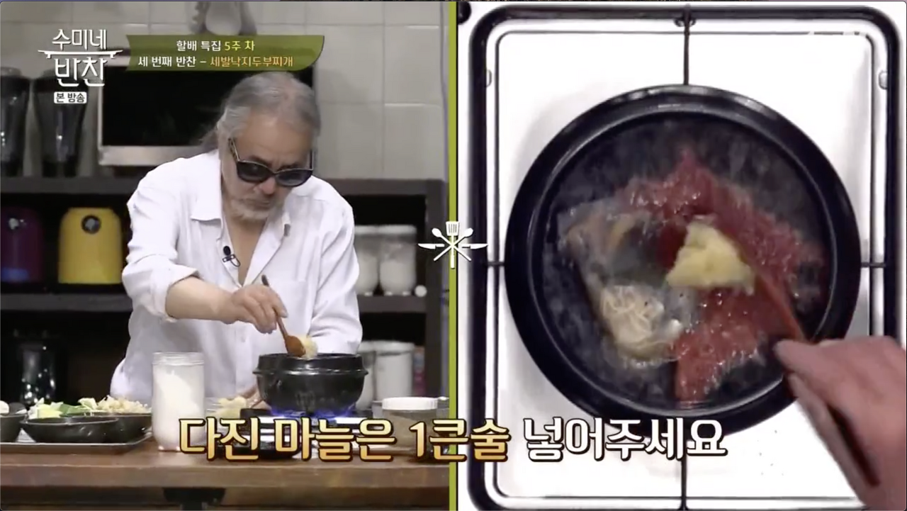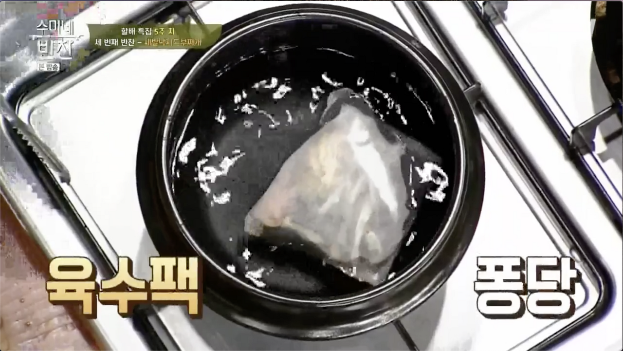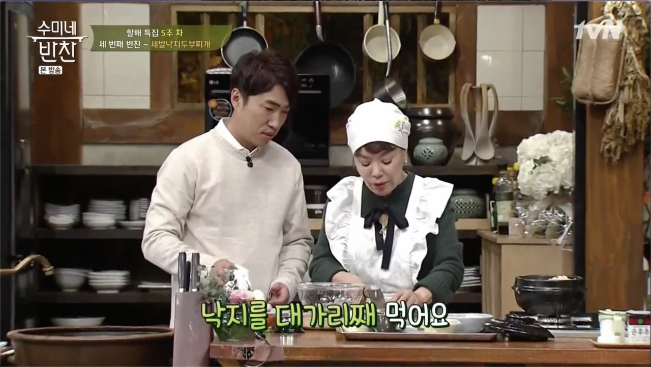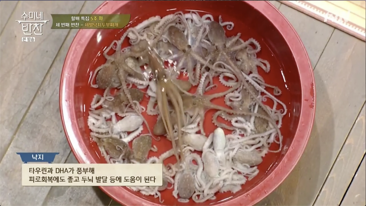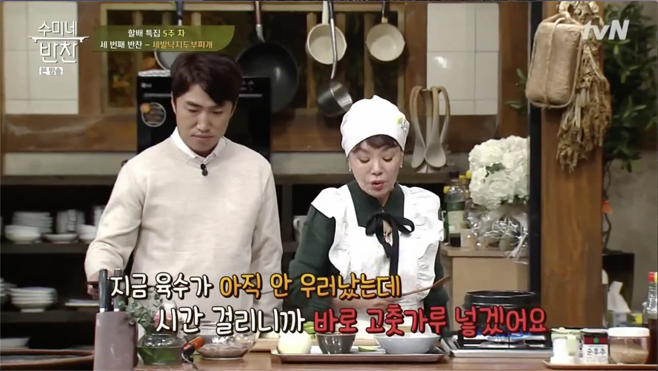 13. 마지막으로 국물 간을 보는데 참고로 낙지는 아직 넣는 것이 아니구요, 밥상차릴 동안 넣어도 된다고 해요. 또한 낙지 대가리는 먹물이 나와서 안 자른다고 하시네요.
