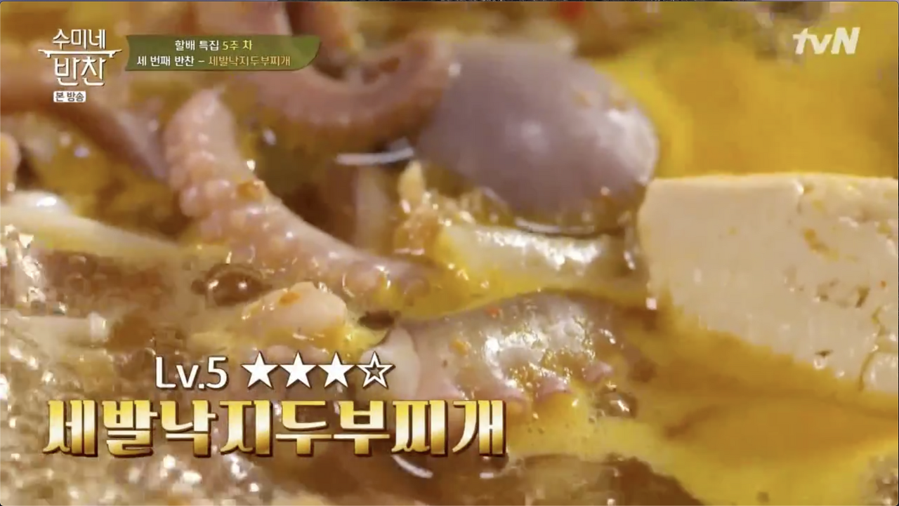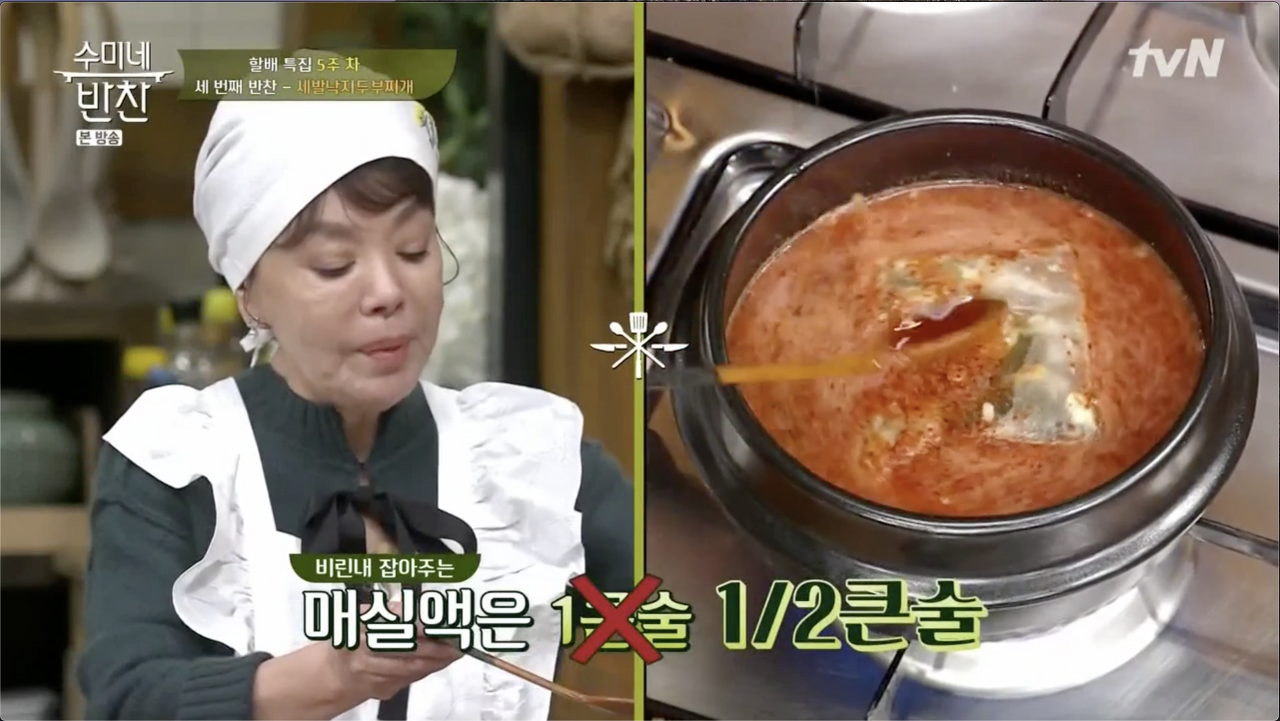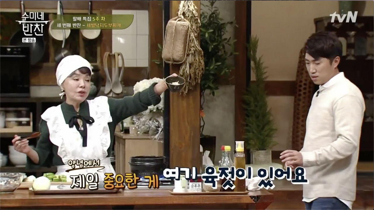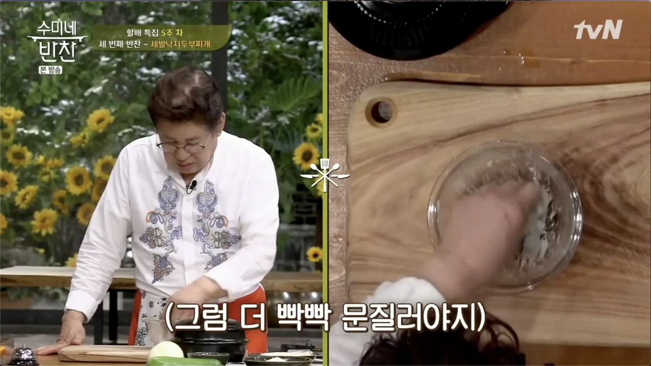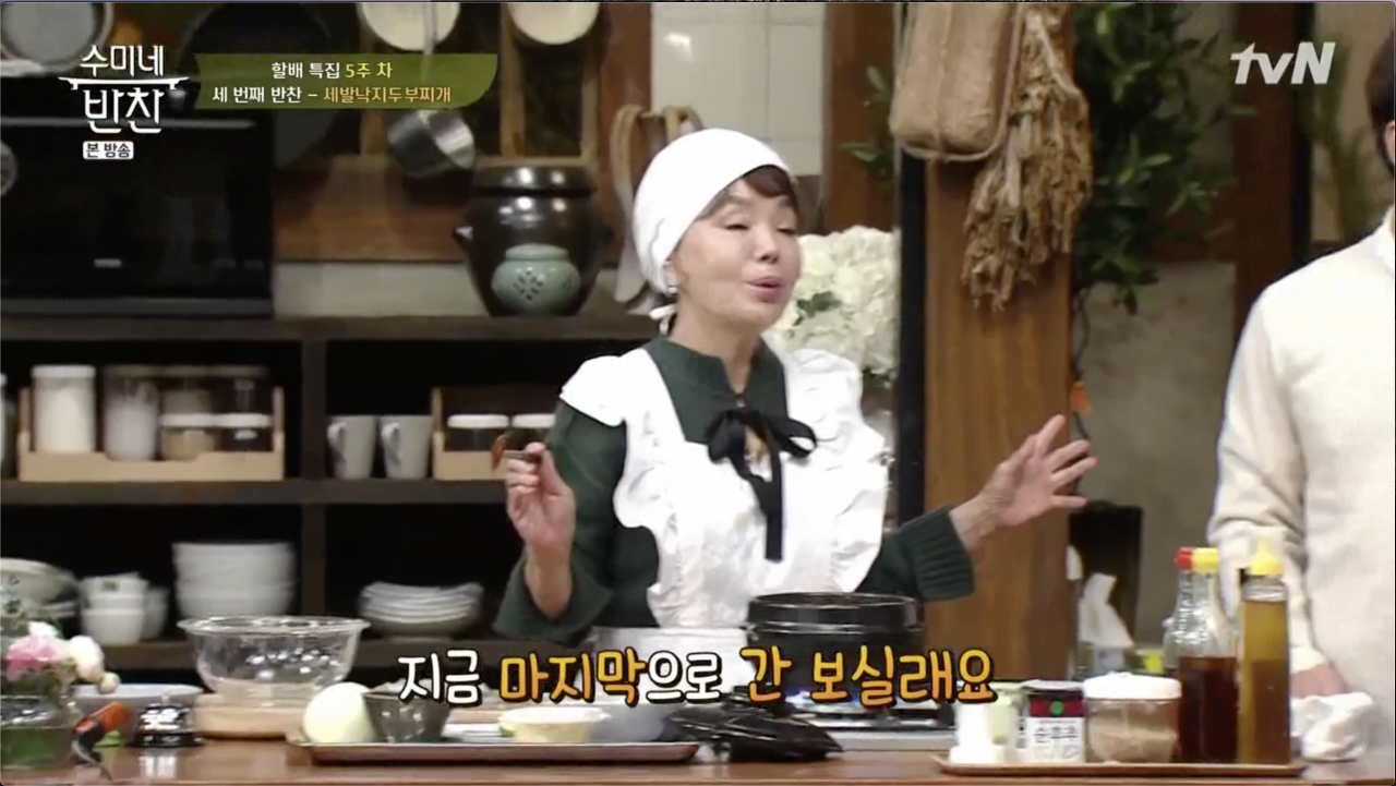 13. 마지막으로 국물 간을 보는데 참고로 낙지는 아직 넣는 것이 아니구요, 밥상차릴 동안 넣어도 된다고 해요. 또한 낙지 대가리는 먹물이 나와서 안 자른다고 하시네요.