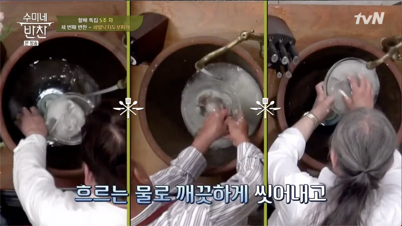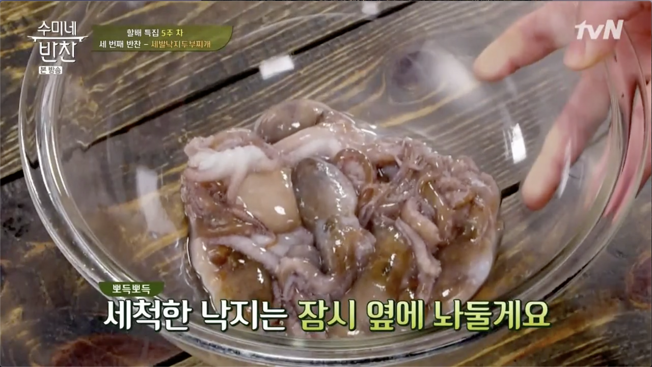 2. 밀가루로 문지른 낙지는 흐르는 물로 깨끗하게 씻고 새척한 낙지는 잠시 옆에 놔두세요.