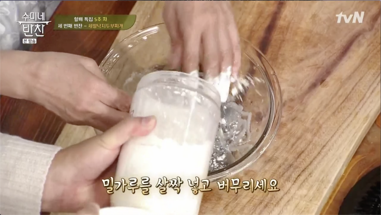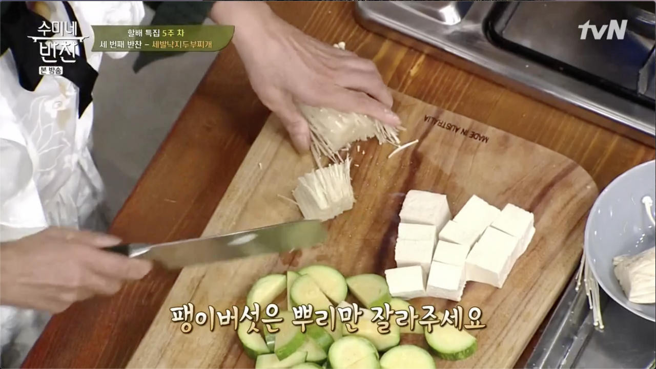 7. 팽이버섯은 뿌리만 잘라주는데 아직 육수가 우러나지는 않았지만 시간이 걸리기 때문에 지금 바로 고춧가루를 넣으라고 하시네요. 고춧가루 3작은 술, 다진 마늘 1큰술을 넣어주세요.