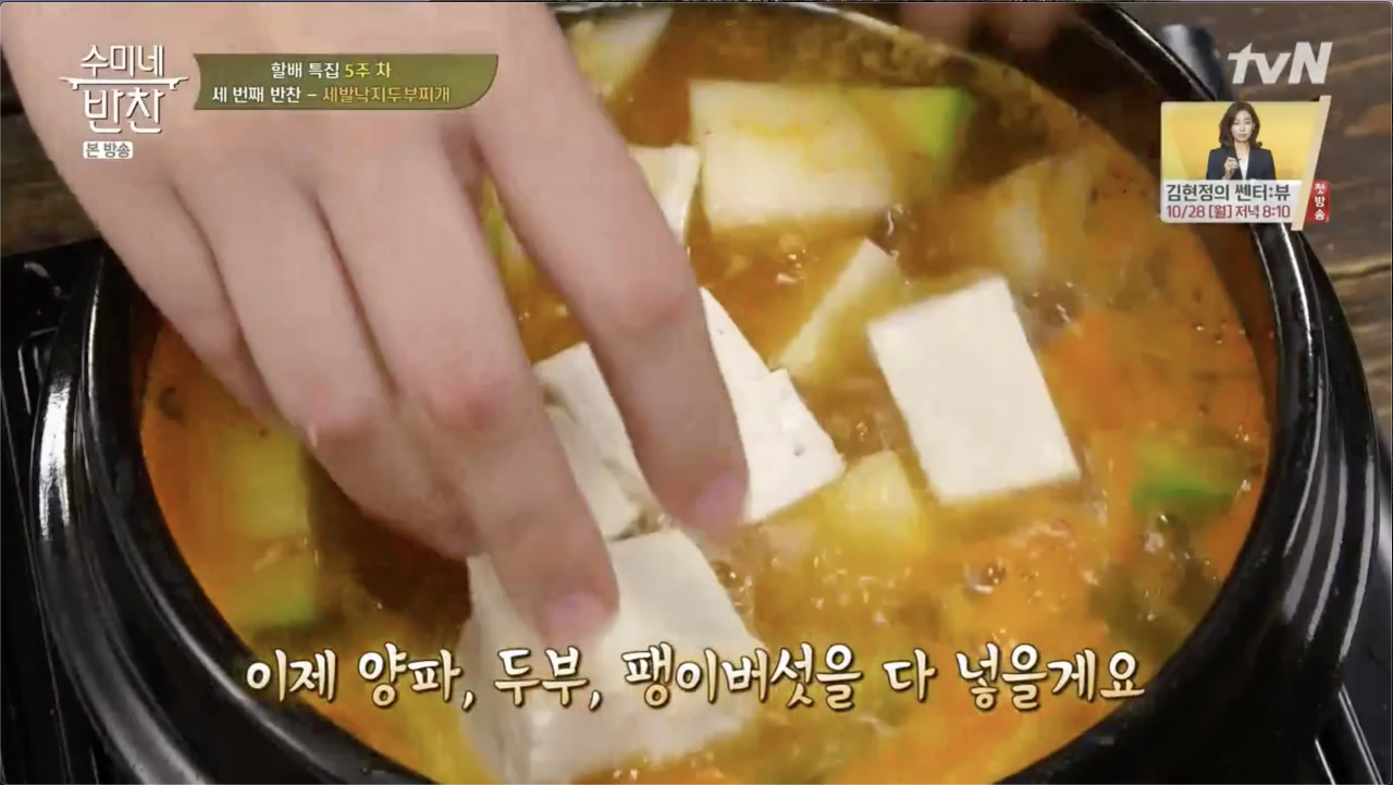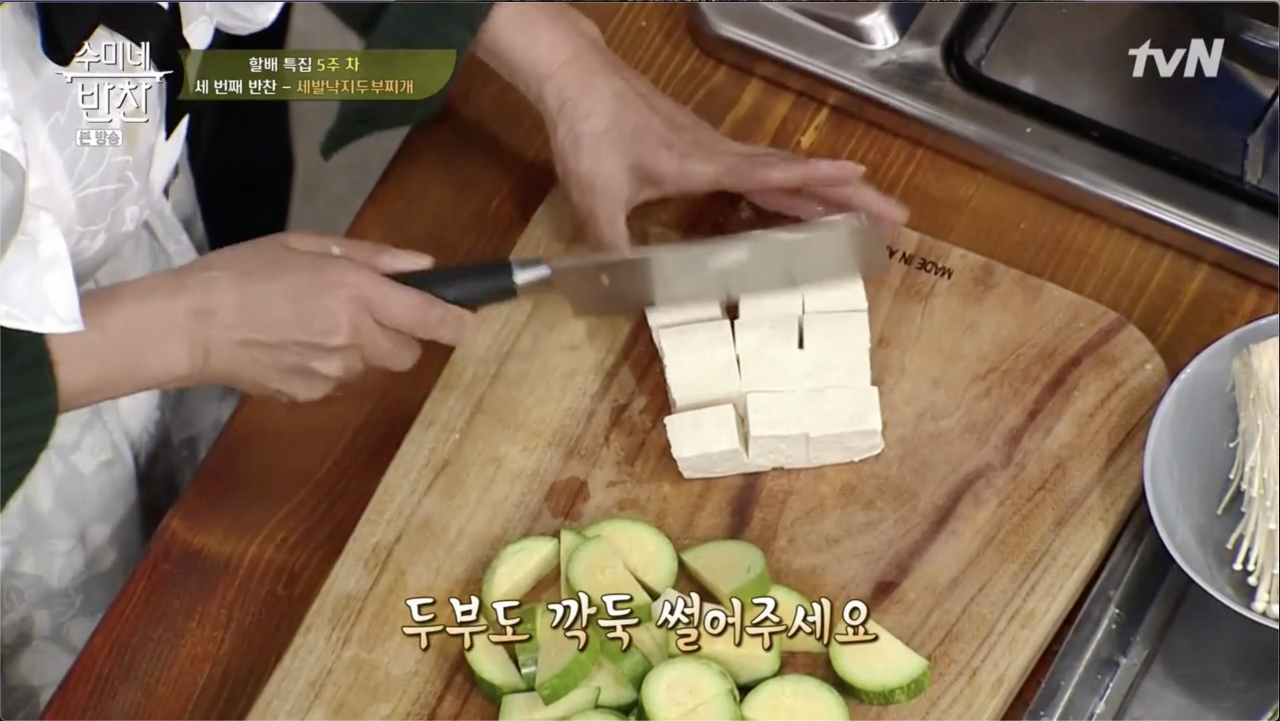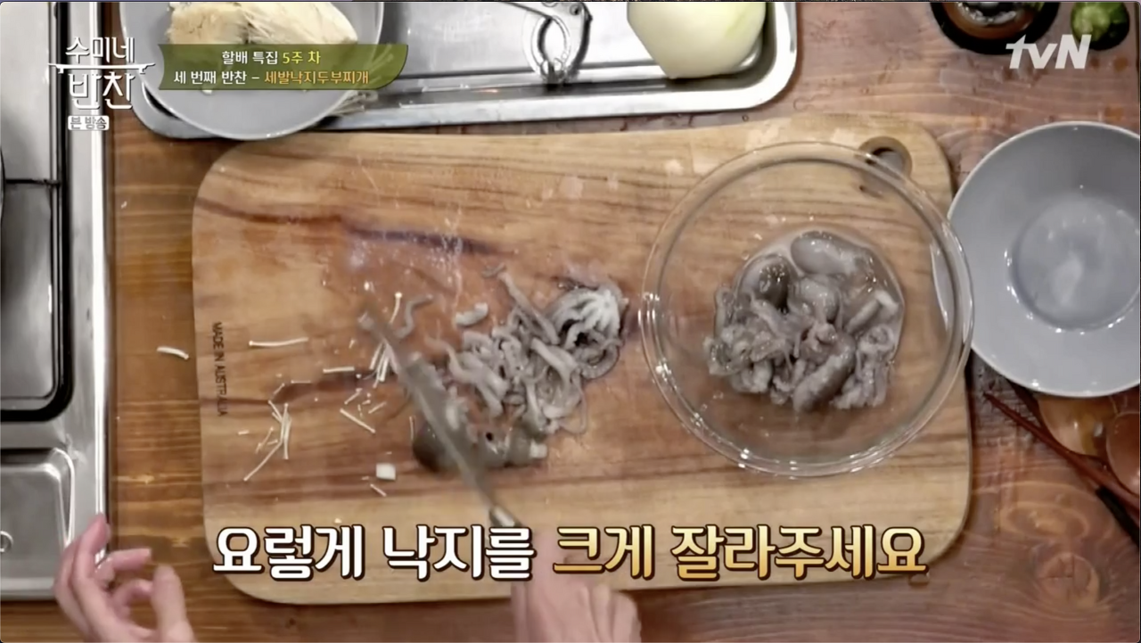 12. 오늘 만드는 두부찌개 맛있게 끓이는법 황금레시피에서는 낙지도 대가리째 먹을 것이기 때문에 낙지를 크게 잘라주세요.