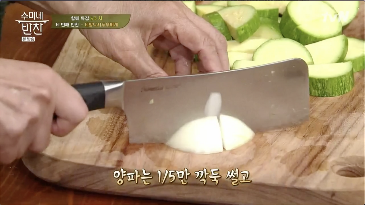5. 이제 두부찌개 맛있게 끓이는법 황금레시피 부재료를 손질할 차례인데요, 애호박 먼저 손질합니다. 애호박은 반달 모양으로 썰어주세요.