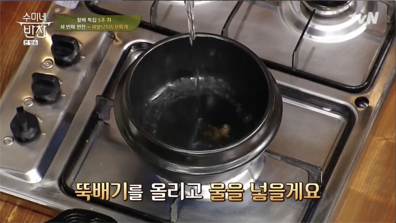 3. 불을 켜고 뚝배기를 올린 다음 물을 넣습니다.
