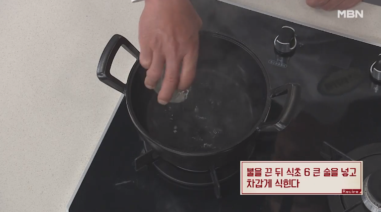 7. 불을 끄고, 식초 6큰술을 넣은 뒤 차갑게 식혀줍니다.