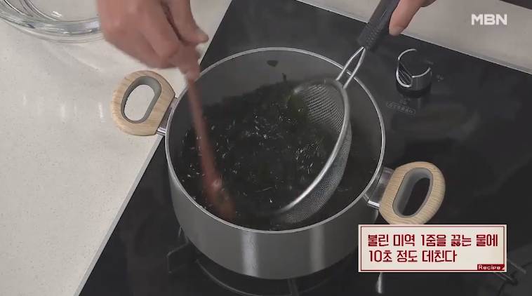 2. 불린 미역 1줌을 끓는 물에 10초 정도 데쳐 주시는데 이렇게 한 번 데쳐야 비린 맛도 제거되고 식감도 좋아진다고 해요.