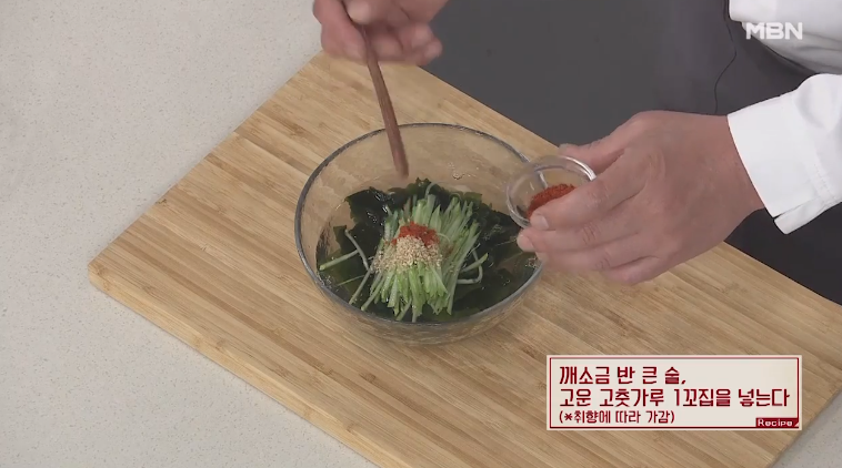 9. 마지막으로 깨 소금 반 큰술, 고운 고춧가루 1꼬집을 취향에 따라 넣어 주시면 미역 오이냉국 황금레시피 미역냉국 만드는법이 완성됩니다.