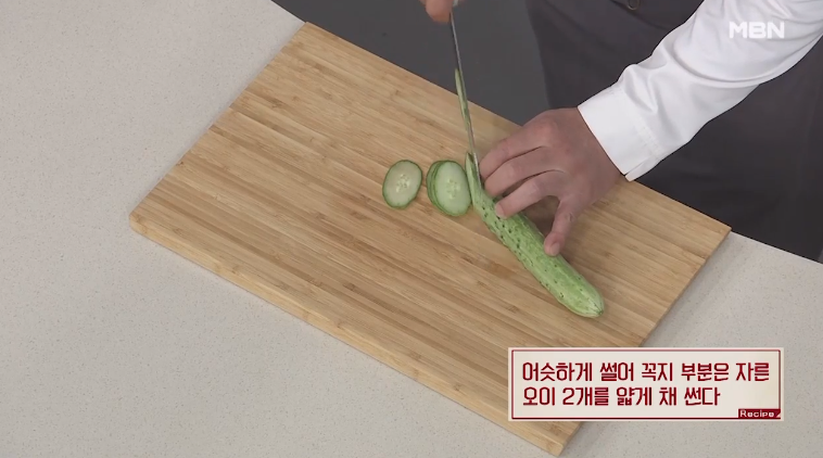 1. 먼저 미역 오이냉국 재료를 손질해야 하는데요, 어슷하게 썰어 꼭지 부분을 자른 오이 2개를 얇게 채썰어 줍니다.