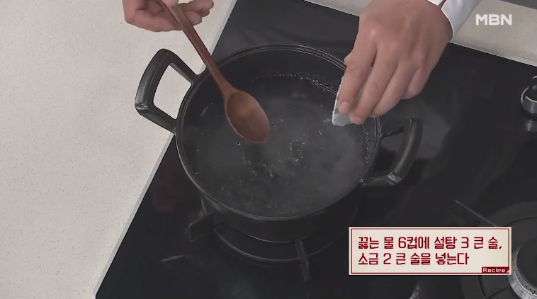 6. 끓는 물 6컵에 설탕 3큰술, 소금 2큰술 넣어 주세요.