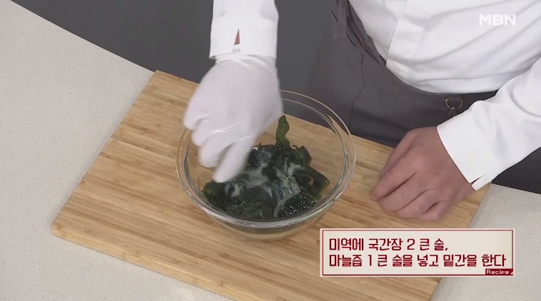 4. 물기를 짠 미역에 국간장 2큰술, 마늘즙 1큰술을 넣어 조물조물 무쳐서 밑간을 합니다.