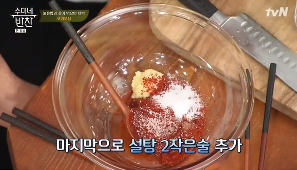 6. 다진 마늘 1작은 술, 설탕 2작은 술을 넣으면 오이무침 황금레시피 양념장이 완성됩니다.