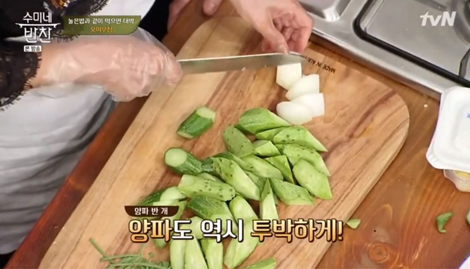 1. 먼저 오이를 손질해보도록 할게요. 오늘 알려드릴 오이무침 황금레시피에서 가장 독특한 부분이라고 볼 수 있는데요, 수미쌤은 오이를 정말 투박하게 썰어 준비하시더라구요. 써는 방식에 따라서 식감이 완전히 달라지기 때문이라고 하네요.
