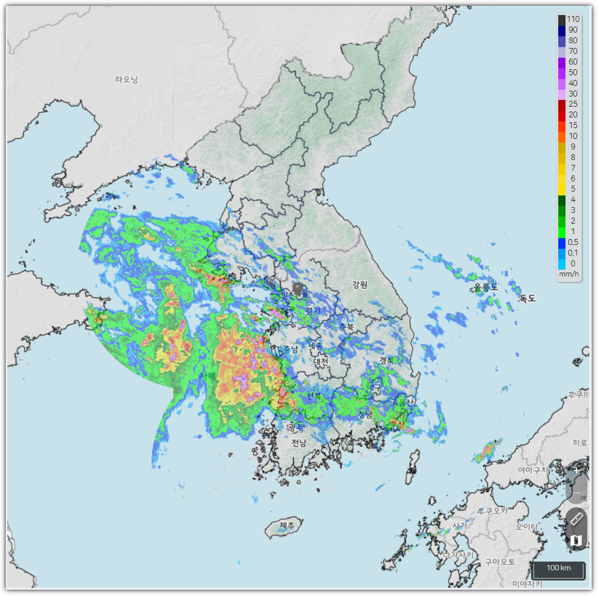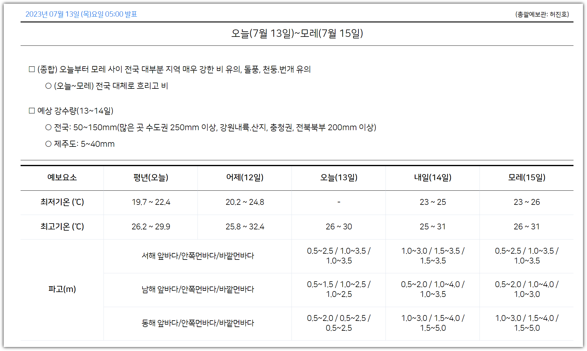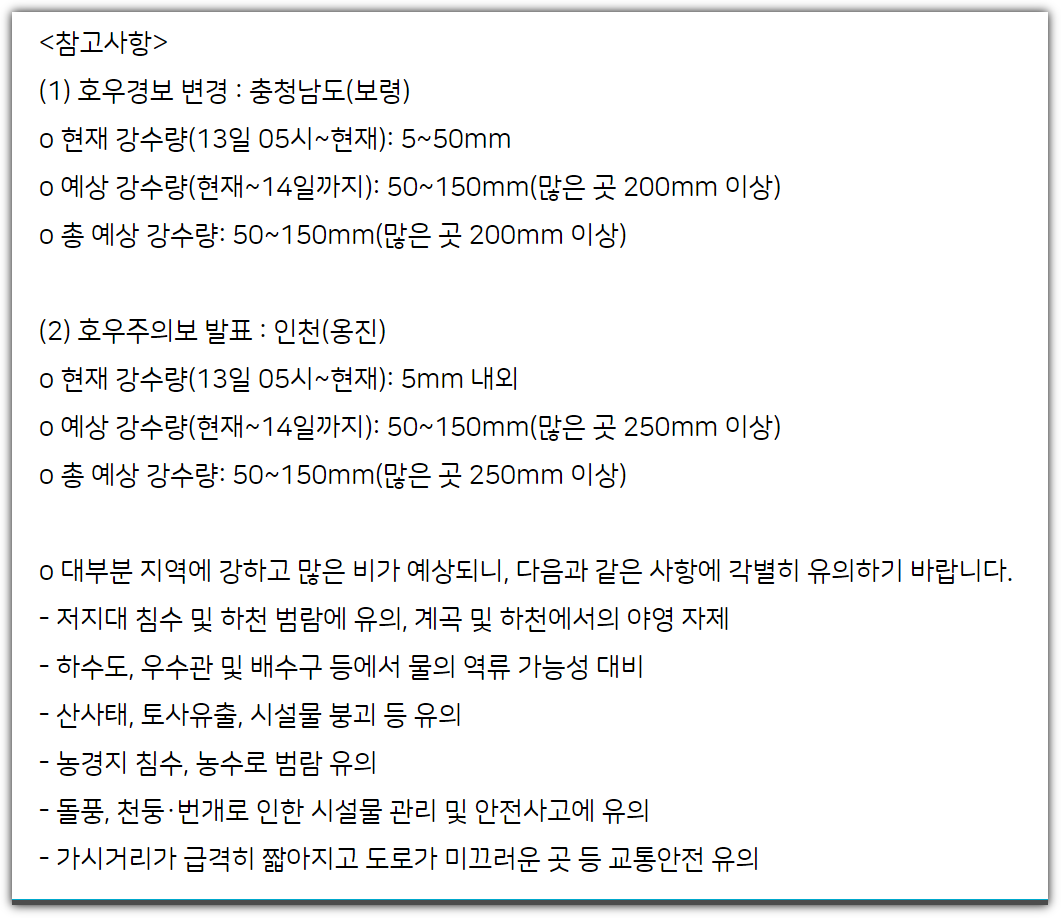 - 13일 : 발해만 인근에 저기압이 강하게 발달하면서 강한 비가 북한 쪽에만 치우쳐 내릴 수 있습니다. 13일부터 14일까지 예상 강수량은 제주 5~40㎜, 그 밖의 전국 50~150㎜정도이며 수도권에 비가 많이 오는 곳은 250㎜ 이상 내릴 수 있을 것이라는 예보입니다. 강원 내륙·산지, 충청 북부는 최대 200㎜ 이상 폭우가 쏟아지겠으며 13일 오후부터는 시간당 30~80㎜의 비가 수도권과 강원 내륙·산지, 충청 북부 곳곳에 쏟아질 수 있으니 참고하시기 바랍니다.
