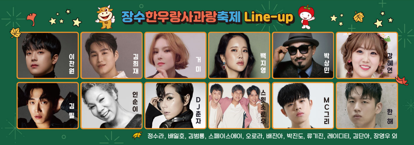 국화꽃길, 가족정원, 볏짚공예 조형물 전시 등을 통해 더욱 풍성하고 볼거리 가득한 프로그램들이 구성돼 관광객들에게 특별한 즐거움이 될 것으로 보입니다. 제 17회 장수 한우랑 사과랑 축제 일정 및 행사 프로그램, 초대가수 등 자세한 정보를 정리해보도록 하겠습니다.