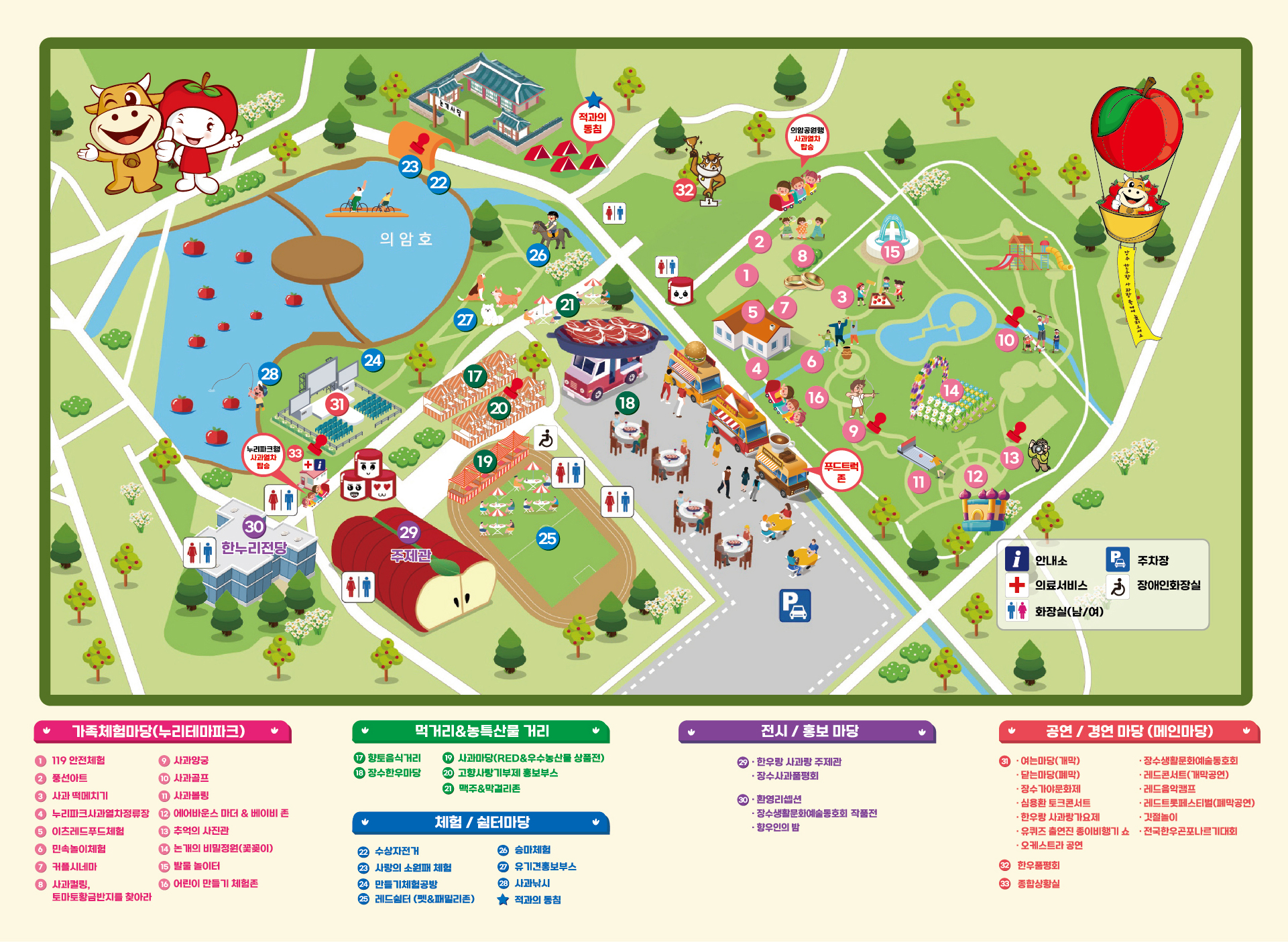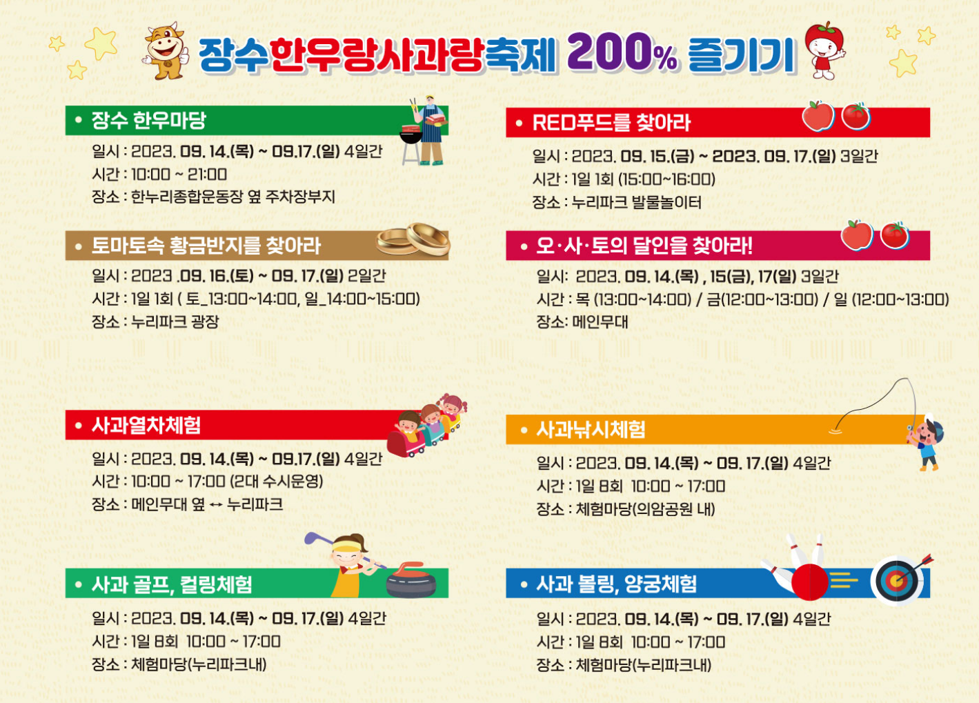 ● 행사내용 장수한우마당, 농.특산물 판매, 한우와 사과를 활용한 각종 체험, 축하공연