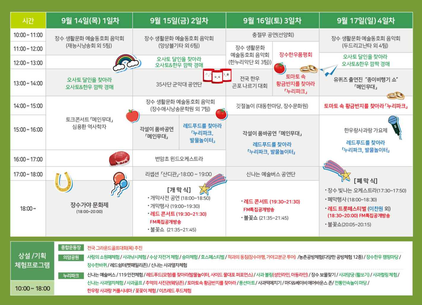 지금까지 제 17회 장수 한우랑 사과랑 축제에 대해 살펴봤습니다. 이번 축제는 장수 생활문화 예술동호회 음악화, 심용환 역사학자와 함께하는 토크콘서트, 장수가야문화제를 시작으로 ▲레드푸드를 찾아라 ▲레드콘서트 ▲오사토 달인을 찾아라 ▲레드음악캠프 ▲레드트롯페스티벌 등 다양한 행사가 준비돼 있어 더욱 기대를 모으고 있습니다.