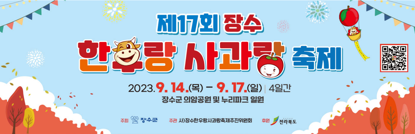 제 17회 장수 한우랑 사과랑 축제를 자세히 안내해 드리도록 하겠습니다. 17주년을 맞이하는 '전북 장수 한우랑 사과랑 축제’가 14일 화려한 막을 올릴 예정입니다. 이번 장수 한우랑 사과랑 축제는 14일부터 17일까지 4일간 장수읍 의암공원 및 누리파크 일원에서 펼쳐질 예정인데요,
