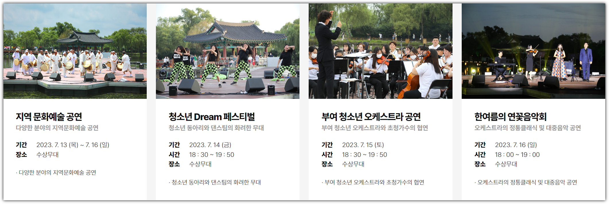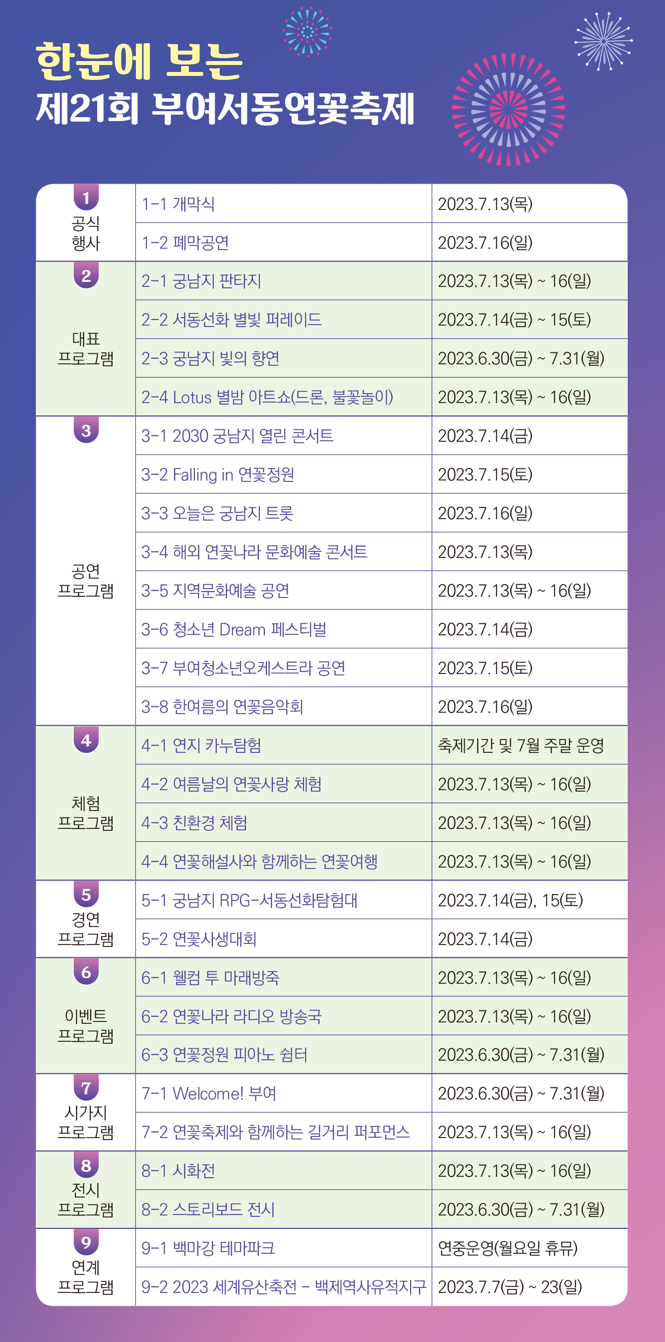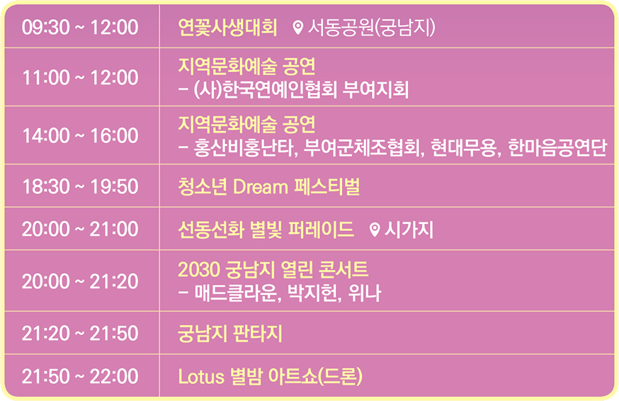 ● 여름날의 연꽃사랑 체험: 연꽃 20종을 운영하고, 다양한 연꽃 체험을 제공합니다. 7월 13일부터 16일까지 궁남지 연지길에서 체험할 수 있습니다.