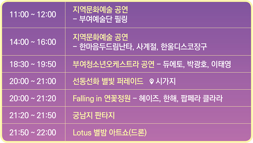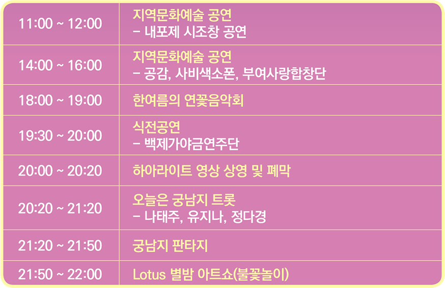 ● 개막식: 7월 13일 (목) 오후 8시부터 수상무대에서 식전공연, 개막선포 등 공식행사와 궁남지 판타지 뮤지컬 공연이 진행됩니다.