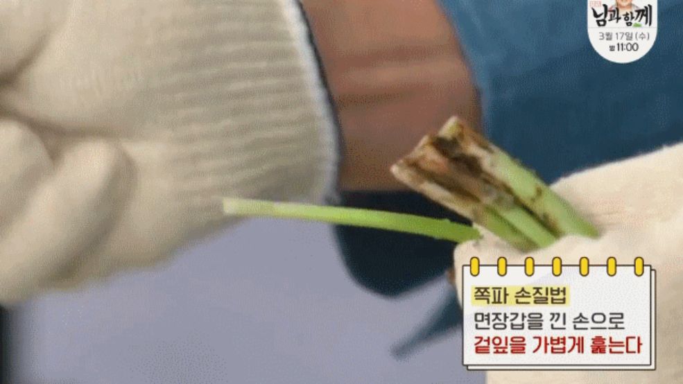 3. 참고로 쪽파 겉잎을 벗길 때 맨손으로 하면 쪽파 뿌리 쪽 진액 때문에 미끄러워서 시간이 오래 걸리는데 면장갑을 끼고 겉잎을 가볍게 훑어주면 아주 쉽게 다듬을 수 있답니다.